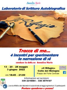 La scrittura autobiografica viaggia! Venerdì 13 maggio, presso il Rifugio del Melogno, inizierà un Laboratorio di Scrittura Autobiografica sulle Alpi liguri, a 1028 m. di altitudine, proprio sul Colle che collega la riviera ligure di ponente al comune di Calizzano in val Bormida e quindi al Piemonte! Siete tutti benvenuti!