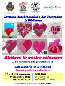 E’ terminato il bellissimo ciclo “I fili della mia vita”. Ringrazio di cuore tutti i partecipanti per l’intensità e l’intimità con cui hanno seguito tutti gli incontri. Ringrazio la Biblioteca Civica “Baccio Emanuele Maineri” di Toirano con il suo direttore dott. Nicola Panizza che ci ospitano sempre con calore e professionalità.