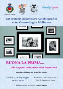 Su richiesta dei partecipanti ai precedenti cicli, ecco un nuovo ciclo di incontri di Scrittura Autobiografica&ArtCounseling dal titolo “BUONA LA PRIMA. ALLA SCOPERTA DELLE PRIME VOLTE IMPORTANTI”, in programma per GIOVEDÌ 11, 18 e 25 MAGGIO, dalle ore 20.30 alle 22.30, presso la sede della Biblioteca Civica “Baccio Emanuele Maineri”