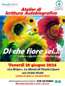 Bella esperienza! Anche in questo Laboratorio di Scrittura Autobiografica si è subito creata un’atmosfera di intimità e di fiducia, uno spazio aperto e protetto dove abbiamo potuto scoprire e condividere insieme il “fiore che abbiamo dentro”! Ringrazio tutti i partecipanti e l’Osteria della Briga che ci ha accolto nella sua rilassante cornice naturale…