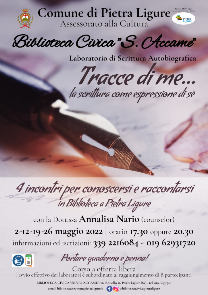Sono lieta di comunicare che condurrò un ciclo di Laboratori di Scrittura Autobiografica ed ArtCounseling presso la Biblioteca Civica di Pietra Ligure!